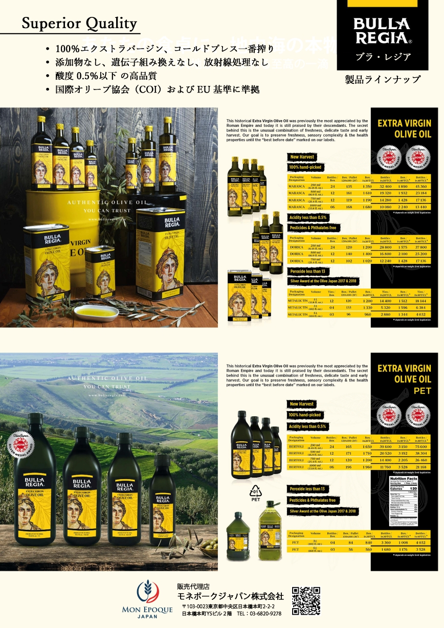 風味とアロマ • 完熟オリーブのフルーティーな香り • アーモンドやナッツを思わせる繊細なニュアンス • 新鮮で調和のとれた洗練された味わい 品質保証 • 100%エクストラバージン、コールドプレス一番搾り • 添加物なし、遺伝子組み換えなし、放射線処理なし • 酸度 0.5%以下 の高品質 • 国際オリーブ協会(COI)および EU 基準に準拠 栄養と健康効果 • 最大85%オレイン酸を含む一価不飽和脂肪酸が豊富 • 天然の抗酸化物質とビタミンを多く含有 • コレステロールゼロ、完全無添加 • 健康的で地中海式の理想的な食生活をサポート 製品ラインナップ • メタル缶 5L / PET ボトル 5L • 光と熱から守る最適なパッケージング • 18~24か月 の鮮度保持 BULLA REGIA が選ばれる理由 ✔ ピュアでプレミアムな品質 ✔ 健康的で自然な、世界基準の安心品質